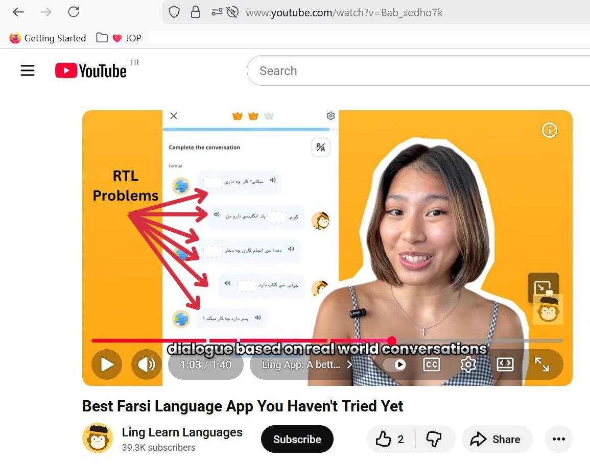 For example, we recently analyzed the promotional material for the Ling App, which markets itself as a top Farsi alternative. In their own demonstration video, the Persian text is displayed with Left-to-Right (LTR) alignment, effectively spelling the sentences backward.