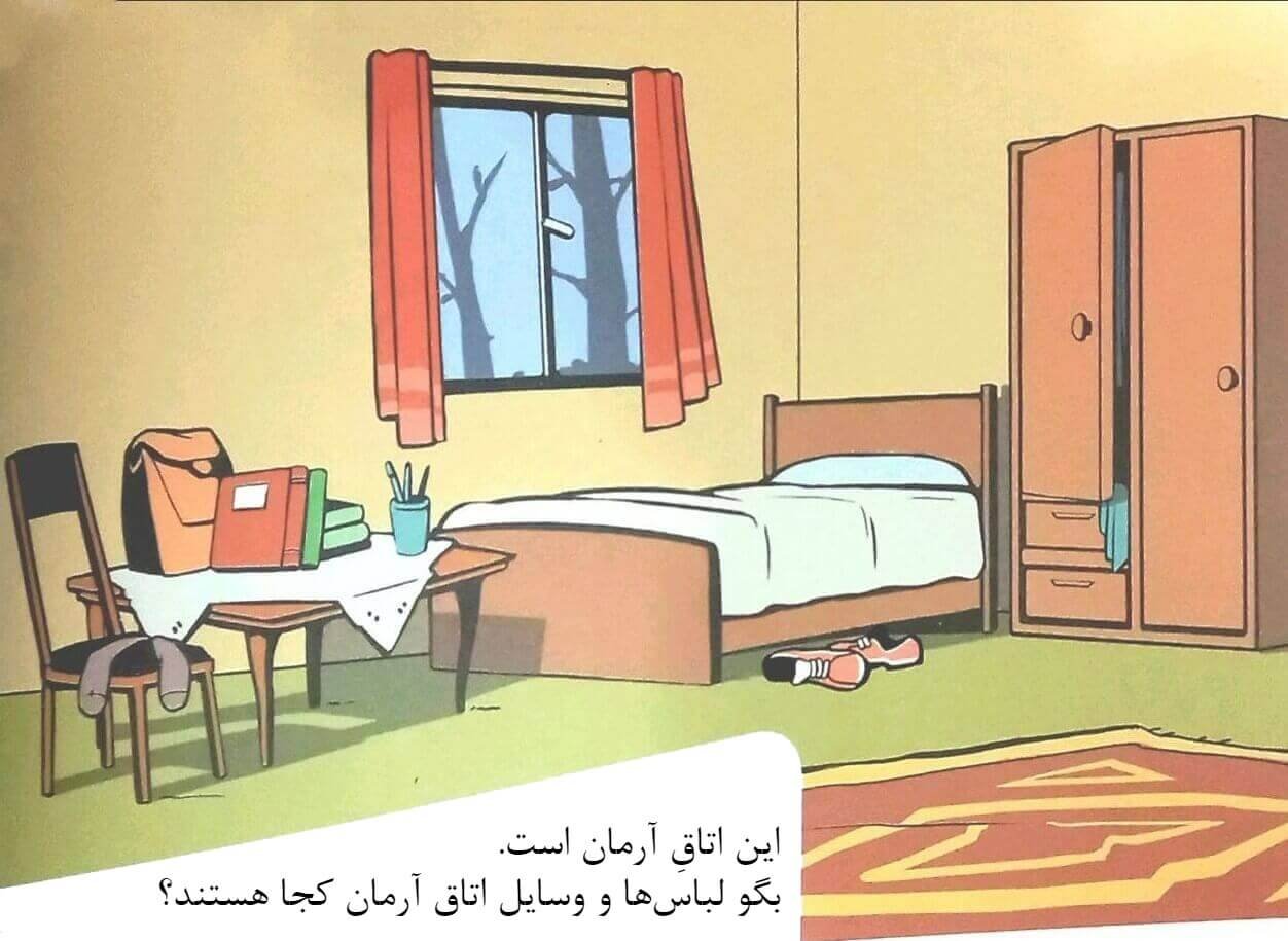 | کفش آرمان کجاست؟ جورابهایش کجاست؟ … … ؟ | 🤔 | زیر تخت روی صندلی … … . |