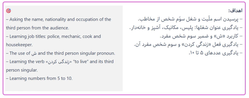- The book is provided in PDF format, accessible on both Windows and mobile applications (Android and Apple). However, reading the PDF version within these applications can be cumbersome, as our experience indicates. Locating the corresponding audio files also presented a significant challenge. After diligently searching the Taagcheh website and elsewhere, including two visits to the publisher’s bookstore in Tehran, we confirmed that the audio files were unavailable at the time. Fortunately, we later discovered them by chance on the publisher’s Aparat account. Unfortunately, these audio files are not segmented according to lesson exercises, further undermining a smooth user experience.